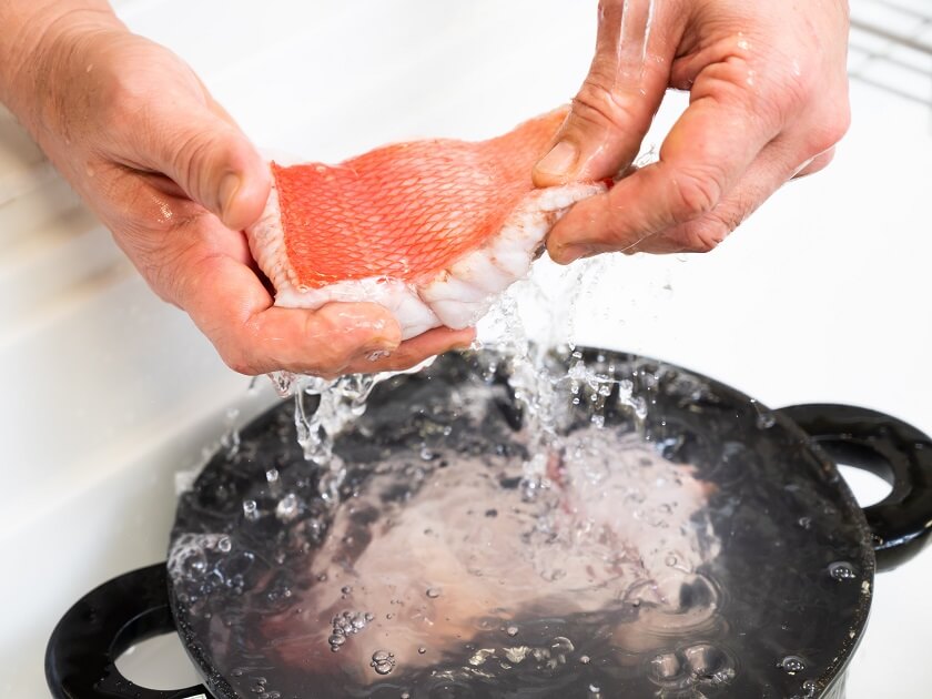 まずは、下ごしらえのポイントを説明いたします。金目鯛はできるだけお腹に張りのある脂がのったものを使ってください。金目鯛は身の舌ざわりも魅力ですので、霜降りの工程は入念に行い、うろこが一枚も残らないようにしましょう。