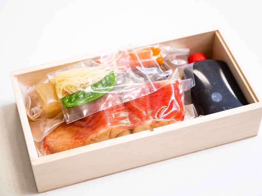 新しい調理工程は、まず粗熱をとった金目鯛、野菜をそれぞれ煮汁から取り出します。当店では、翌日のランチで提供する分はふた付きの密封容器に入れ、テイクアウト用は真空パックします。煮汁に漬けたままだと、素材の色味が損なわれ、味が入り過ぎてしまうので、手早く取り分けるのがポイントです。お召し上がりになる際には、鍋に移して温める、もしくは耐熱容器に移して電子レンジで加熱してください。この「温めなおす」という仕上げ工程ひとつで、丹念に煮上げられた「金目鯛の煮付け」を高い回転率が求められるランチメニューとしても提供できるため、ピークタイム対応に奮闘する飲食店にとって心強い味方になるはずです。