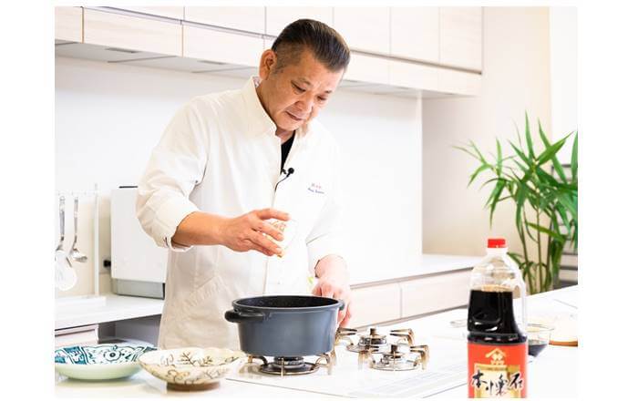 煮付けにおける醤油の役割は味付けだけではありません。私は「煮る」工程で醤油を3回に分けて加えます。手始めに、金目鯛を煮始める際にほんの数滴。おまじない程度ですが、金目鯛の煮汁の吸い込みが良くなります。次は、煮汁が煮詰まってきたタイミングに加えると、煮付けの代名詞とも言える“照り”が出ます。そして、火を落とす直前にひとまわし。「ヤマサ重ね仕込しょうゆ 本懐石」のふくよかな香りを全体に行きわたらせます。従来の煮付けであれば、以上で完成です。