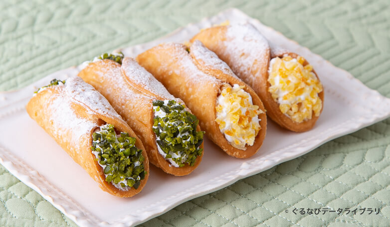 筒状に揚げた生地の中にリコッタチーズクリームを詰めたイタリア・シチリア名産のスイーツ。現在は通年食べられているが、元々は謝肉祭を祝って食べる季節のスイーツであった。