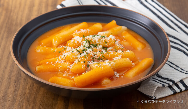 トマトソースと生クリームやホワイトソースを混ぜたロゼソースに、コチュジャンやニンニクを入れ、トッポギに合わせた韓国料理。