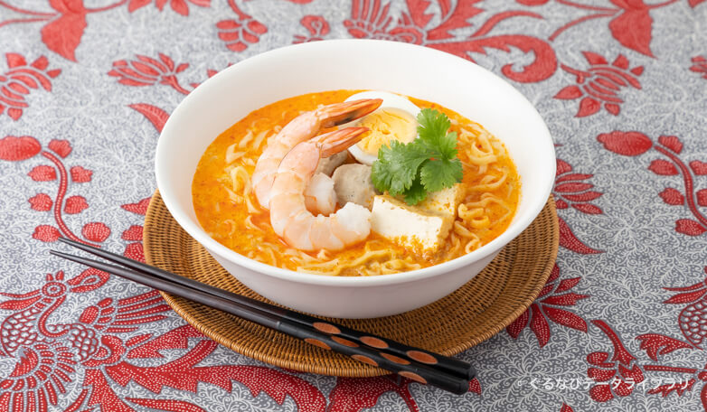 シンガポールを代表する麺料理で、ココナッツミルクや干しエビの出汁、独特の香辛料が効いたスパイシーなスープが特徴。本場のラクサは米粉麺を主流としているが、日本では小麦粉麺と米粉麺を選べる飲食店が多い。