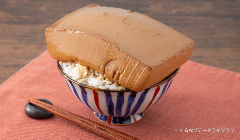 岡山県発祥の郷土料理もあるが、現在注目されているのは、醤油や出汁で煮込んだ豆腐を丼にまるごとのせたスタイルで、おでん専門店が発祥。