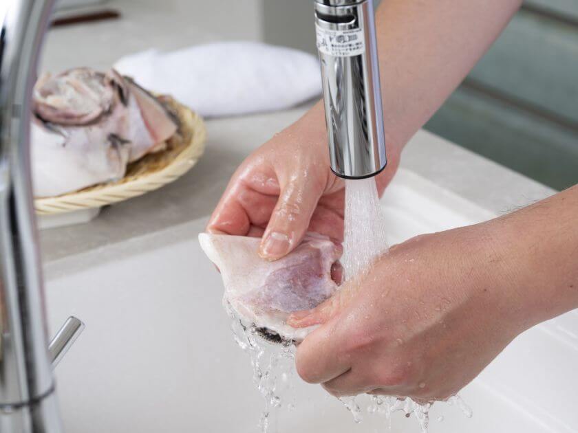 仕込みの時に出るアラや肉の切り落とした部分、野菜の皮などをまとめておきます。魚は血合いなどをきれいにしてから霜降りにし、さらに優しく洗って臭みのもとになるぬめりを取り除きましょう。