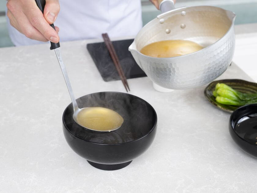 太白油と黒コショウ、「ヤマサ重ね仕込しょうゆ 本懐石」を入れた器に、出来上がったスープを注ぎ、ゆでた麺を入れて整え、青味を飾ります。今日はミニ青梗菜を使いました。味つけは醤油と、野菜から出る甘味だけ。魚の塩味で醤油の量は調整します。