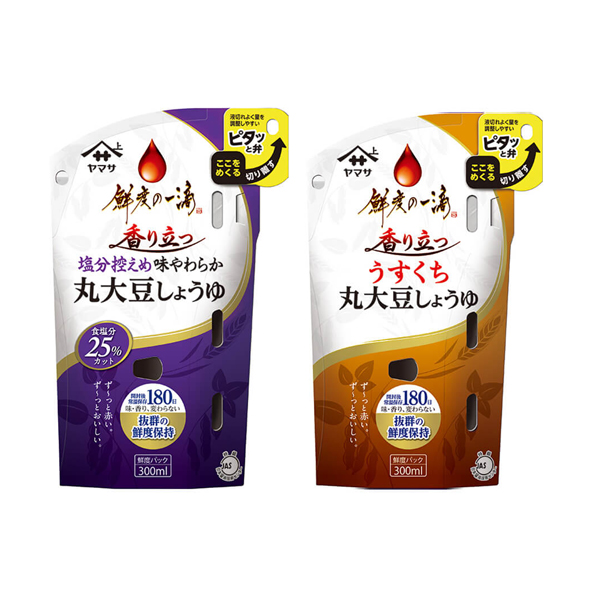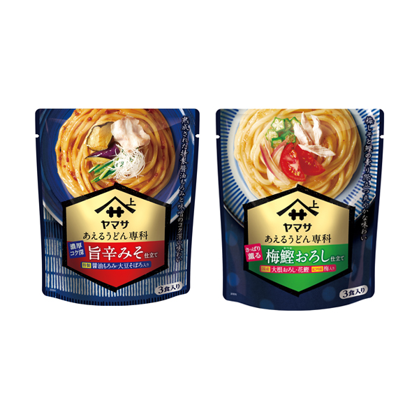 『ヤマサ あえるうどん専科 旨辛みそ仕立て 3食入』105g袋(つゆ35g×3袋)、 『ヤマサ あえるうどん専科 梅鰹(かつお)おろし仕立て 3食入』120g袋(つゆ40g×3袋)を新発売