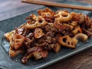 豚バラ肉の甘みに「ヤマサ 香味だし醤油 醤湯(ジャンタン) 牛だし」をからめることで奥深い味わいに。しっかり焼き付けた豚肉の旨みが蓮根にも染み込み、にんにくの香りが食欲をそそるガツンとした一品。
