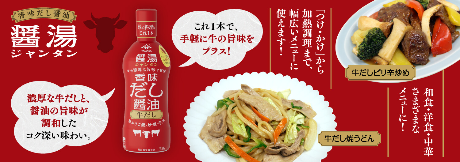 「ヤマサ 香味だし醤油 醤湯(ジャンタン) 牛だし」は、牛肉の旨味と醤油の旨味の調和がとれた、贅沢な牛だし醤油。つけ・かけから炒めものまで幅広く使え、これ1本でだしの旨味を効かせた本格感のある料理に仕...