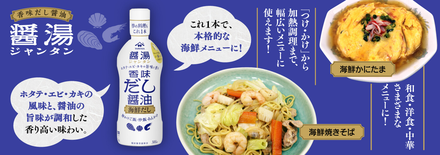 「ヤマサ 香味だし醤油 醤湯(ジャンタン) 海鮮だし」は、ホタテ・エビ・カキのだしの効いた濃厚な醤油です。料理全体に海鮮の芳醇な香りとコクを手軽にプラスできますつけ・かけから炒めものまで幅広く使える1...