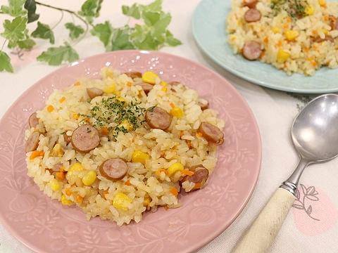 炊飯器で簡単にできるピラフ。炊き上がったら「ヤマサ 香味だし醤油 醤湯(ジャンタン) 牛だし」とバターを入れ、全体を混ぜ合わせて完成。炊き上がりに「ヤマサ 香味だし醤油 醤湯(ジャンタン) 牛だし」を混ぜることで、より香ばしく香りが立ちます。