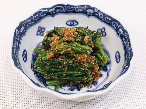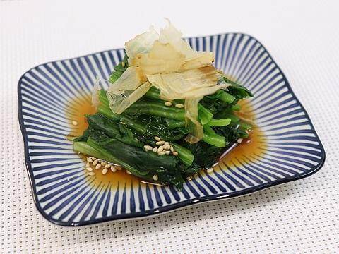 まずはお試しいただきたい、シンプルな青菜のおひたし。茹でたほうれん草を食べやすい長さに切り器に盛り、「ヤマサ 香味だし醤油 醤湯(ジャンタン) 海鮮だし」、かつおぶし、いりごまをかけるだけで、いつもの青菜のおひたしが一味違った味わいになります。