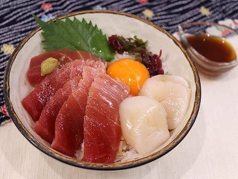 5分で完成!彩りもきれいな海鮮丼。ごはんにお刺身を盛り、「ヤマサ 香味だし醤油 醤湯(ジャンタン) 海鮮だし」をかけるだけで、香り高い海鮮丼が簡単にできます。