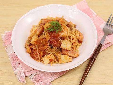 「ヤマサ 香味だし醤油 醤湯(ジャンタン) 海鮮だし」とトマト缶を合わせれば、本格イタリアンのパスタが完成!仕上げに、「ヤマサ 香味だし醤油 醤湯(ジャンタン) 海鮮だし」とオリーブオイルをかけ、風味を付けるのがポイント。