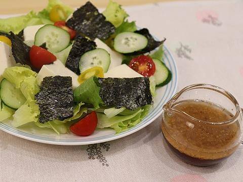色々なサラダによく合う、「ヤマサ 香味だし醤油 醤湯(ジャンタン) 海鮮だし」の手作りドレッシング。「ヤマサ 香味だし醤油 醤湯(ジャンタン) 海鮮だし」に、酢とサラダ油、そしてすりごまを入れるのがポイントです。