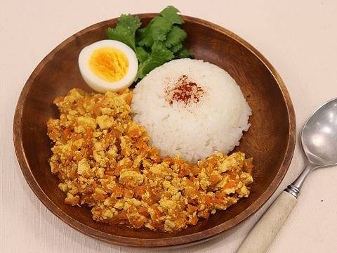 肉に見えるのは、なんと木綿豆腐!肉なしでも、「ヤマサ 香味だし醤油 醤湯(ジャンタン) 牛だし」でコクと旨味アップ、ヘルシーなビーガンカレーです。
