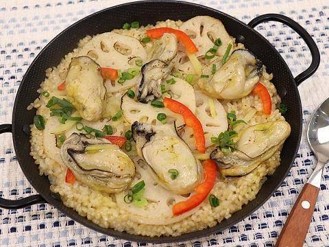 ホームパーティーを盛り上げるパエリアも、「ヤマサ 香味だし醤油 醤湯(ジャンタン) 海鮮だし」にお任せ♪ カキとれんこんが入った、和テイストな一品です。