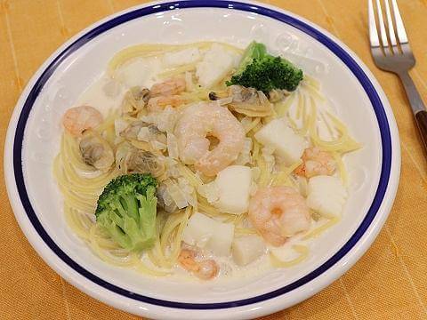 「ヤマサ 香味だし醤油 醤湯(ジャンタン) 海鮮だし」の旨味豊かな出汁が効いたスープパスタ。「ヤマサ 香味だし醤油 醤湯(ジャンタン) 海鮮だし」と牛乳を合わせることで、まろやかな味わいに仕上がります。