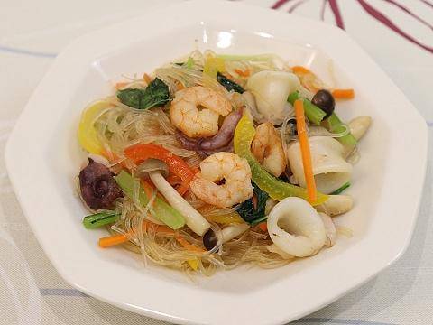 戻した春雨にシーフードミックスを加え、「ヤマサ 香味だし醤油 醤湯(ジャンタン) 海鮮だし」ににんにくとしょうがを効かせて炒めた、海鮮春雨炒め。