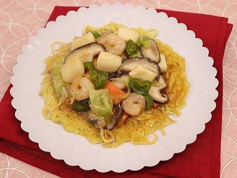 シーフードミックスを利用して手軽に作れる、「ヤマサ 香味だし醤油 醤湯(ジャンタン) 海鮮だし」を使った、あんかけ焼きそば。あんかけが麺によく絡み、あとひくおいしさです。