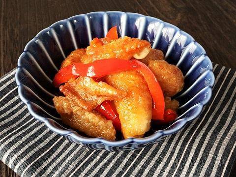 カリッと焼いた鶏の皮を、「ヤマサ ぱぱっとちゃんと これ!うま!!つゆ」の調味液に浸すだけ。パプリカも加えた、彩りのよい一品です。ちょっとした箸休め、おつまみにもおすすめです。
