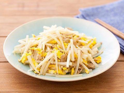 大根の皮を千切りにし、卵とツナと炒めれば、あっという間にできあがり!「ヤマサ ぱぱっとちゃんと これ!うま!!つゆ」の旨味と大根の皮のシャキシャキ感がおいしい一品です。