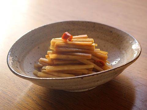 細切りにした大根の皮を「ヤマサ 絹しょうゆ」と「ヤマサ昆布ぽん酢」の調味液に漬けるだけ。ぽりぽりとした食感が、あと引くおいしさです。