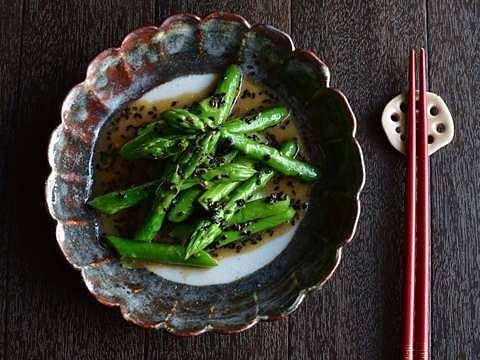 アスパラを電子レンジで加熱して、「ヤマサごまだれ専科」と黒ごま・ごま油で和えるだけの簡単さが魅力。”3種のごま”の香りたっぷりで、あとをひくおいしさ♪
