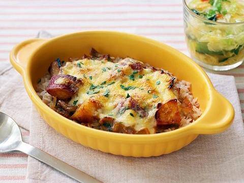 10分で作れる、熱々ドリア!豆乳を混ぜたごはんに、「さつまいもと豚肉の旨辛煮」とシュレッドチーズをのせ、あとはトースターにお任せ♪