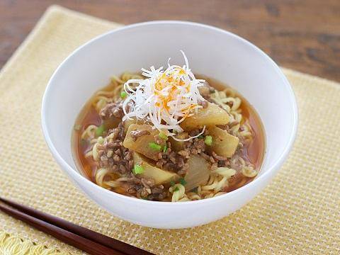 器に茹でた中華麺と「辛くないマーボー大根」を入れ、「ヤマサ昆布つゆ白だし」・味噌・水を合わせたスープを注げば、絶品ラーメンの出来上がり!