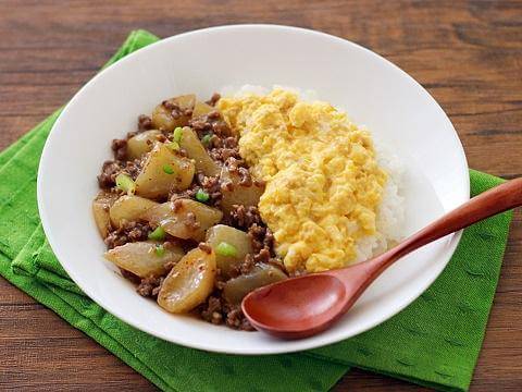 とろりスクランブルエッグと「辛くないマーボー大根」をごはんにかける、ケチャップなしのオムライス。