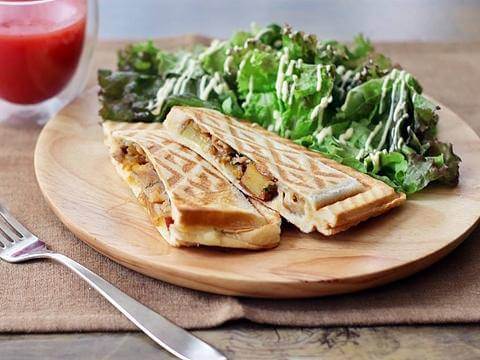 食パンにスライスチーズと「さつまいもと豚肉の旨辛煮」をサンドし、ホットサンドメーカーでこんがりと色よく焼けば、手軽にランチにおすすめな1品の完成です。