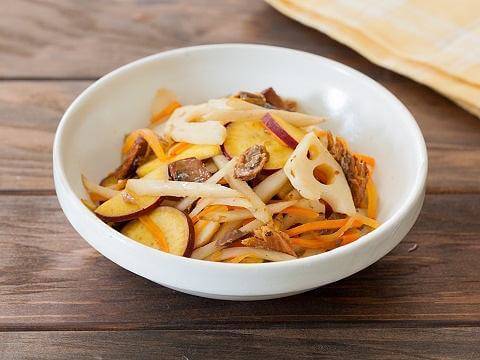 手軽なさんま缶を使った、おかずにもなるきんぴら。根菜と「ヤマサ ぱぱっとちゃんと これ!うま!!つゆ」を先に炒めて味を染み込ませることが、おいしく仕上げるポイントです。