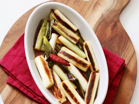 フライパンでこんがりと焼き色をつけた長ねぎを「ヤマサ 絹しょうゆ減塩」ベースのマリネ液に一晩漬けます。シンプルながら、じわっと染みたしょうゆの風味が長ねぎとよく合う一品です。