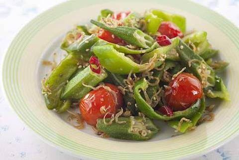 ピーマン、おくら、ミニトマトの夏野菜を彩りよく使った、夏のピリ辛炒め。「ヤマサ昆布つゆ白だし」が野菜の旨味を引き出します。ごま油で炒めたじゃこがアクセント。