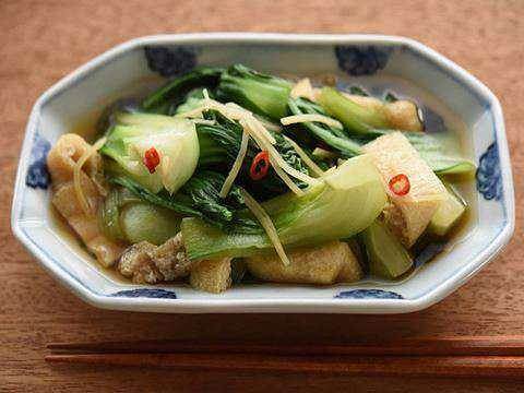 生姜と唐辛子を効かせて、青梗菜と油揚げをさっと煮びたしに。味付けは「ヤマサ昆布つゆ」にお任せ。ピリッとした辛味が、暑い時期でも食欲をかき立ててくれます。