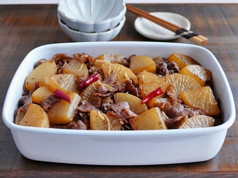 いちょう切りにした大根を牛肉と合わせ、このままおかずとしても楽しめる一品。鷹の爪のピリ辛味風味がクセになり、後ひくおいしさです。