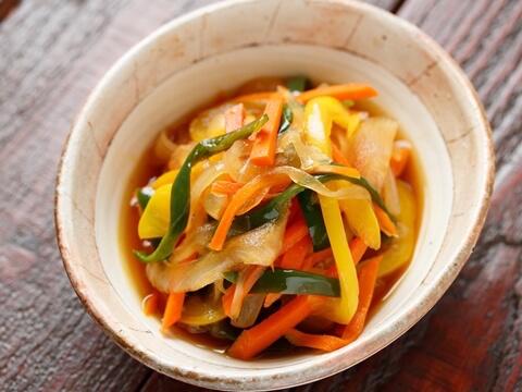 野菜を切ってフライパンで炒めたら、あとは調味料に漬け込むだけ。彩り豊かなので一品おかずのトッピングなどにも重宝します。