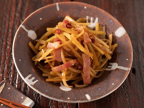 大根の皮をおいしく食べる救済レシピ。細切りにした大根の皮をベーコンと合わせきんぴらに!白いごはんにもよく合う甘辛味です。