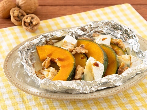 ホイルで焼き上げたかぼちゃはホクホク!とろ~りとろけたチーズやカリッと香ばしいくるみと合わせて、ワインなどにも合うおしゃれなおつまみに。