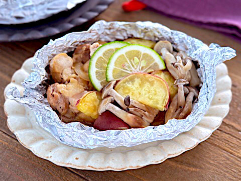 鶏肉と秋野菜たっぷりのホイル焼き。バターしょうゆのコクとパンチでお腹も大満足な一品に!仕上げにすだちを添えてさわやかに。