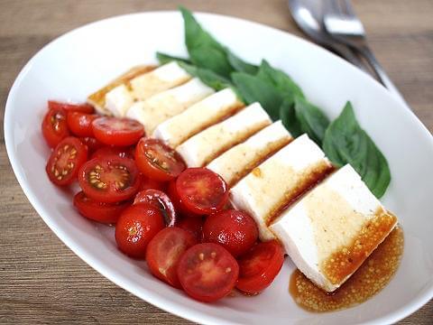豆腐をモッツァレラチーズに見立てた和DEミックスな一品。カットしたミニトマトを「ヤマサ 絹しょうゆ」やオリーブオイル、きび砂糖で和え、豆腐とバジルと共に盛り合わせます。