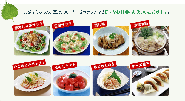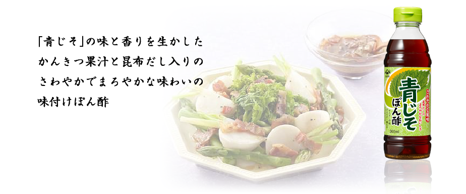 ぽん酢といえば、鍋調味料というイメージがありましたが、『ヤマサ 青じそぽん酢』は香り高く、さわやかな風味で、食材本来の味を引き立てますのでお鍋はもちろん、豆腐、魚、肉料理やサラダなど、たれやドレッシング感覚で様々なお料理にお使いいただけます。