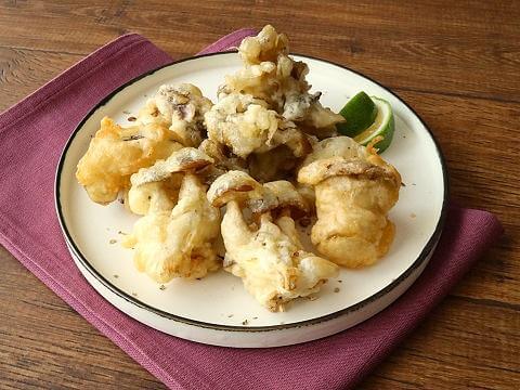 「ヤマサ昆布つゆ 白だし」で衣に味付けしたきのこのフリットは、炭酸水を入れることでカラッと揚がるのがポイント。仕上げに山椒をふり、かぼすを絞っていただきます。