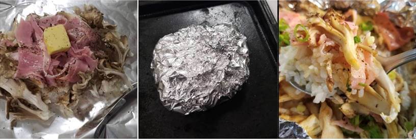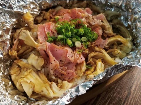 アルミホイルにご飯をのせ「ヤマサ ぱぱっとちゃんと これ!うま!!つゆ」をふりかけ、その上にまいたけ・ベーコン・バターの順に具材をのせ、酒と黒こしょうをふりかけ包んだら、オーブントースターで15分程焼くだけ。