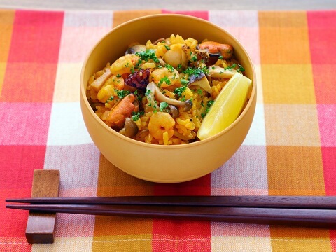 定番と一味違う釜飯を楽しみたいなら、スペイン風はいかがでしょう?冷凍のシーフードミックスを使って手軽に作れるパエリア風、レモンをキュッと絞ってさわやかにいただきます。