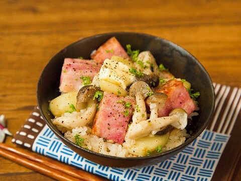 ■きのこと塊ベーコンのうま塩にんにく釜飯