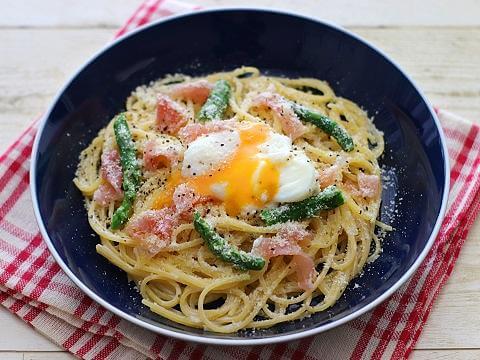 牛乳と水に「ヤマサ ぱぱっとちゃんと これ!うま!!つゆ」を加え、スパゲッティーをゆでる斬新メニュー!フライパンのままテーブルに出し、温泉卵を崩し、麺と絡めて仕上げます。