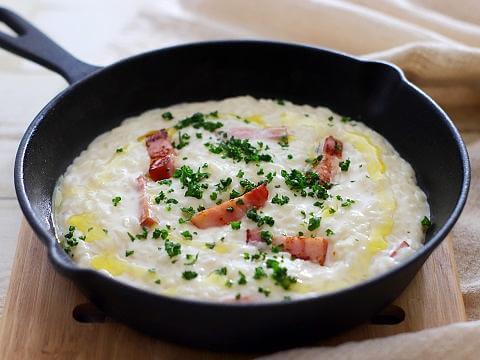 残りごはんをさっと洗って、チャチャッとできあがるチーズリゾット。生クリームやバターは使わず、「ヤマサ ぱぱっとちゃんと これ!うま!!つゆ」と牛乳の、相性の良さを楽しめるひと品です。