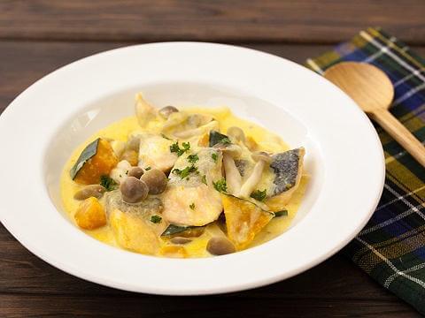 鮭とかぼちゃを使用した和風クリーム煮は、牛乳を使うことでお子様からご高齢の方まで食べやすい味付けに。鮭に片栗粉をまぶして焼くことで、煮崩れることなく仕上がります。