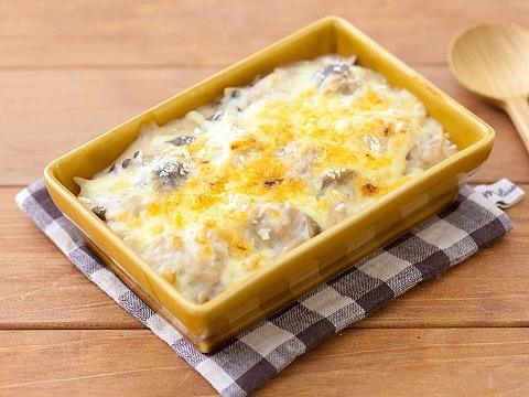 米粉と「ヤマサ ぱぱっとちゃんと これ!うま!!つゆ」を使って作る和風グラタン。あっさりとしつつも、うま味がしっかり感じられる味わいに。低脂肪牛乳を使用することで、脂質もオフしています。